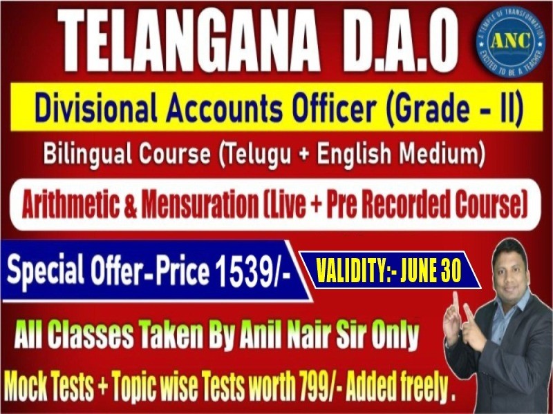 తెలంగాణ D.A.O Paper-2 (Arithmetic & Mensuration ) Special Course ( Bilingual ) 👉 అన్ని ఆప్టిట్యూడ్ లైవ్ క్లాస్లను అనిల్ నాయర్ సర్ (మాజీ కెరీర్ లాంచర్-సౌత్ ఇండియా హెడ్ ఆఫ్ డెప్ట్-మ్యాథ్స్) తీసుకుంటారు. 👉అన్ని కాన్సెప్ట్లు బేసిక్స్ నుండి అడ్వాన్స్డ్ వరకు కవర్ చేయబడ్డాయి 👉 సులభమైన, ఉత్తమమైన మరియు వేగవంతమైన Concepts, Shortcuts, Methods 👉 డబ్బు ముఖ్యం కాదు కానీ ఉపాధ్యాయుని అనుభవం మరియు సబ్జెక్ట్లో అతని నైపుణ్యం. 👉 భారతదేశంలో ఆన్లైన్ కోచింగ్లో అత్యధిక Google Reviews -4.9/5 రేటింగ్తో 4000+ సమీక్షలు- 👉 సరసమైన ధరలు-ప్రీమియం కంటెంట్. 👉 వీడియో కోర్సులో 45000+ నమోదు చేసుకున్న విద్యార్థులు (సున్నా ప్రకటనలతో భారతదేశంలో వేగంగా అభివృద్ధి చెందుతున్న ఎడ్యుటెక్ కంపెనీ) 👉తరగతి గది ప్రశ్నలు ద్విభాషలో ఉంటాయి (తెలుగు + ఇంగ్లీష్) 👉క్లాస్రూమ్ కాన్సెప్ట్ వివరణ తెలుగులో ఉంటుంది 👉ప్రత్యేక డౌట్ సాల్వింగ్ సెషన్స్ 👉 స్మార్ట్ బోర్డు తరగతులు 👉ఏదైనా లైవ్ క్లాస్లకు హాజరు కాలేని పక్షంలో విద్యార్థి తమ చెల్లుబాటు ముగిసే వరకు తర్వాత కూడా చూడవచ్చు 👉ఆఫ్లైన్ డౌన్లోడ్ అందుబాటులో ఉంది 👉కోర్సు చెల్లుబాటు: - June 30 👉పరీక్షా ఆధారిత వ్యూహాలు 👉 క్లాస్ చెల్లుబాటు గడువు ముగిసే వరకు వెబ్ & మొబైల్ యాప్లో వీక్షించవచ్చు. 👉 ఇంటర్నెట్ వేగం తక్కువగా ఉంటే వీడియో నాణ్యతను మార్చవచ్చు 👉 మీ అవసరాన్ని బట్టి వీడియో వేగాన్ని 1.25X, 1.50X,...కి మార్చవచ్చు 📞 WHATSAPP : 8050067891. తెలుగు /English మీడియం స్టూడెంట్స్ కోసం స్పెషల్ D.A.O Bilingual రికార్డ్ చేసిన Video క్లాసులు కోర్సు+ లైవ్ వీడియో క్లాసులు + పరీక్షలు కోర్సు Topics covered in the Course 👉 Number System ( సంఖ్యా వ్యవస్థ ) 👉 Algebra ( బీజగణితం ) 👉 Geometry ( రేఖా గణితం ) 👉 Mensuration ( క్షేత్రగణితం ) 👉 Probability ( సంభావ్యత ) 👉 Permutation & Combination (ప్రస్తారాలు - సంయోగాలు) 👉 Trigonometry ( త్రికోణమితి ) 👉 Co-ordinate Geometry ( నిరూపక రేఖాగణితం ) 👉 Statistics - ( సాంఖ్యాకశాస్త్రము ) 👉 Reasoning - ( రీజనింగ్ ) 👉 English - ఇంగ్లీష్ 👉 All classes taken by Mr. Anil Nair. 👉 4000+ Solved Problems, 1000+ Concepts, 3000+ Shortcuts 👉 All Concepts covered from basics to Advanced 👉 Easy, Best and Fast Shortcuts 👉 Result Oriented Course (Inclusive of Pre-Recorded Classes + tests + E-books) 👉 10+ hrs Weekly 6-8 new updated Classes will be uploaded (Advanced Problems will be discussed) Disclaimer:- Under Unavoidable Circumstances- If any live class is interrupted because of the technical reasons-Recorded classes for the same will be provided under content section. 👉 సులభమైన, ఉత్తమమైన మరియు వేగవంతమైన Concepts, Shortcuts, Methods 👉 డబ్బు ముఖ్యం కాదు కానీ ఉపాధ్యాయుని అనుభవం మరియు సబ్జెక్ట్లో అతని నైపుణ్యం. 👉 భారతదేశంలో ఆన్లైన్ కోచింగ్లో అత్యధిక Google Reviews -4.9/5 రేటింగ్తో 4000+ సమీక్షలు- 👉 సరసమైన ధరలు-ప్రీమియం కంటెంట్. 👉 వీడియో కోర్సులో 45000+ నమోదు చేసుకున్న విద్యార్థులు (సున్నా ప్రకటనలతో భారతదేశంలో వేగంగా అభివృద్ధి చెందుతున్న ఎడ్యుటెక్ కంపెనీ) 👉తరగతి గది ప్రశ్నలు ద్విభాషలో ఉంటాయి (తెలుగు + ఇంగ్లీష్) 👉క్లాస్రూమ్ కాన్సెప్ట్ వివరణ తెలుగులో ఉంటుంది 👉Weekly 6-8 hrs new content will be uploaded every week till June 1st week. 👉 All Live classes Classes taken by Mr. Anil Nair అన్ని క్లాసులు అ